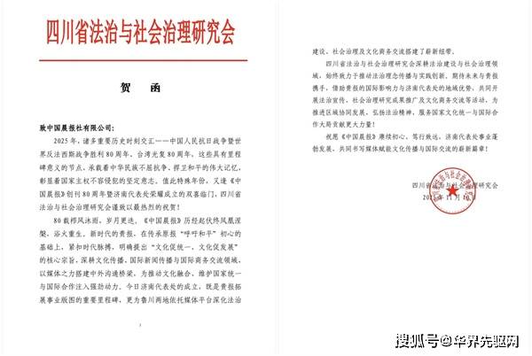 2025年11月,四川省法治与社会治理研究会向中国晨报社有限公司发来贺函,对《中国晨报》创刊80周年暨济南代表处成立致以热烈祝贺,双方将携手在法治宣传、社会治理、文化商务交流等领域深化合作,为区域协同发展与国家文化统一贡献力量。